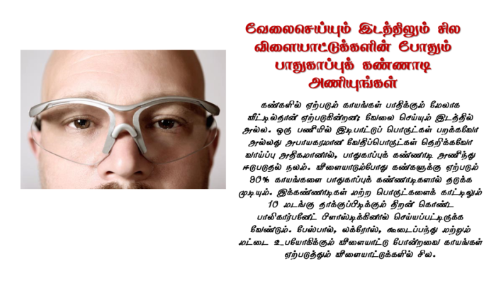 - வேலைசெய்யும் இடத்திலும் சில விளையாட்டுக்களின் போதும் பாதுகாப்புக் கண்ணாடி அணியுங்கள்