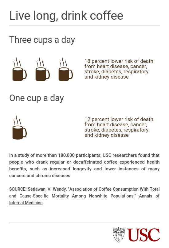 தினமும் ஒரு கப் காபி குடிப்பவர்கள் இறக்கும் வாய்ப்பு, காபியே குடிக்காதவர்களைவிட 12 % குறைவாக உள்ளதாகவும், தினமும் இரண்டு கப் காபி குடிப்பவர்களுக்கு இது 18 % குறைவென்றும் மேற்படி ஆய்வில் தெரிய வந்துள்ளது. மேலும், இவ்விகிதங்கள் சாதாரண காபி குடிப்பவர்களுக்கும், கஃபீன் நீக்கப்பட்ட காபி (decoffeinated coffee) குடிப்பவர்களுக்கும் பொருந்தும் என்கிறார் இந்த ஆய்வுக்கட்டுரையின் பிரதான ஆராய்ச்சியாளர் வெரோனிக்கா செட்டியவான் (Veronica W. Setiawan). இவர் தெற்கு கலிஃபோர்னியா பல்கலைக்கழகத்திலுள்ள (USC) கெக் மருத்துவக் கல்லூரியில் (Keck School of Medicine) பேராசிரியராக பணிபுரிகிறார். இவர்களின் ஆய்வுக்கட்டுரை அன்னல்ஸ் ஆஃப் இண்டர்ணல் மெடிசின் (Annals of Internal Medicine) என்ற மருத்துவ இதழில் ஜூலை 11 -ல் வெளியிடப்படுகிறது.