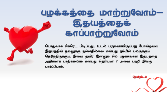 பழக்கத்தை மாற்றுவோம் - இதயத்தைக் காப்பாற்றுவோம்May 28, 2017பழக்கத்தை மாற்றுவோம்- இதயத்தைக் காப்பாற்றுவோம்அதிகமாக டிவி பார்ப்பவராஅசைவ உணவுப்பிரியராஒழுங்கான தூக்கமில்லையாஉடலின் எச்சரிக்கைக் குறியீடுகளை அறியாமல் இருக்கிறீர்களாஉப்பை சாப்பாட்டில் அதிகமாக சேர்த்துக்கொள்கிறீர்களாஎளிதில் உணர்ச்சிவசப்படுபவரா</div>