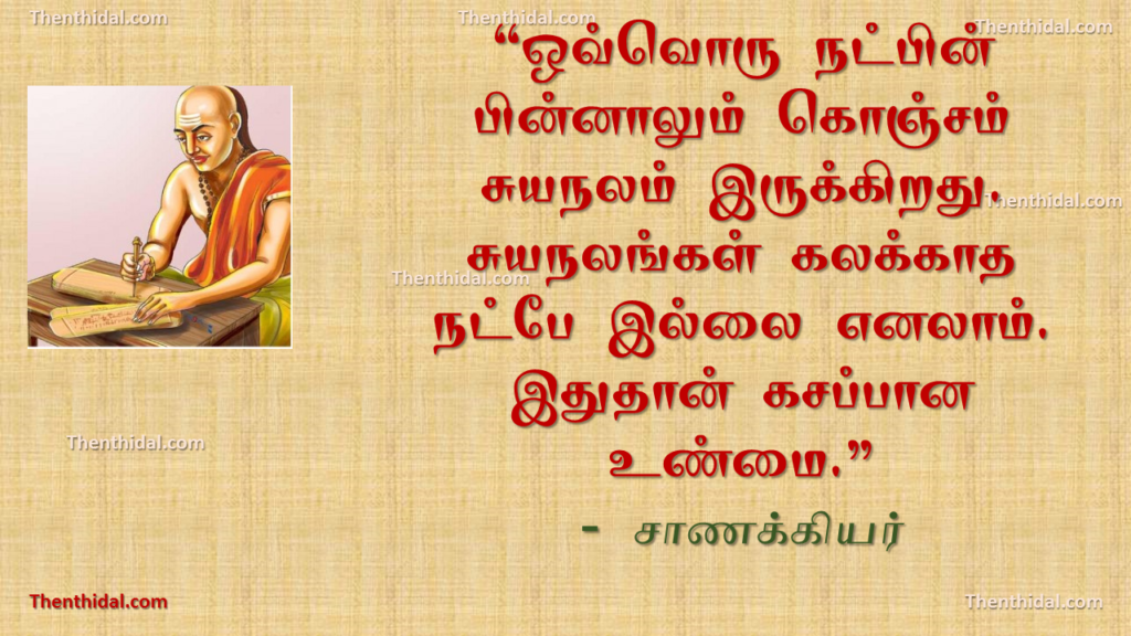 “ஒவ்வொரு நட்பின் பின்னாலும் கொஞ்சம் சுயநலம் இருக்கிறது. சுயநலங்கள் கலக்காத நட்பே இல்லை எனலாம். இதுதான் கசப்பான உண்மை.”