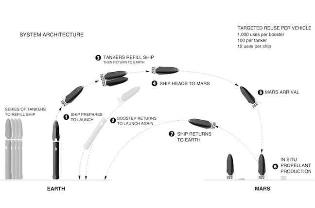 விண்வெளிக் கப்பலும், ராக்கெட் டேங்கர்களும், மீண்டும் மீண்டும் உபயோகிக்கத் தக்கனவாக இருக்க வேண்டும். மேலும், செவ்வாய் கிரகத்தில் விண்கலத்தில் மீத்தேனை எரிபொருளாக நிரப்பி உபயோகித்து, மீண்டும் விண்கலத்தையும், டேங்கர் ராக்கெட்டுகளையும் பூமிக்கு அனுப்ப முடிய வேண்டும். இல்லையென்றால், செவ்வாய் கிரகம் விண்கப்பல்களின் சுடுகாடாக மாறிவிடும், என்கிறார் மஸ்க்.
