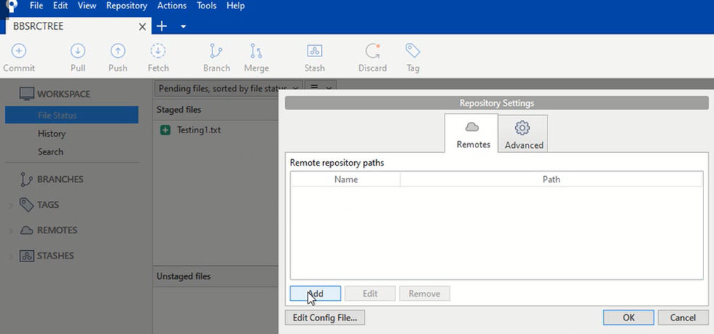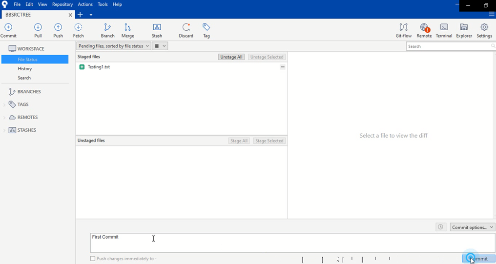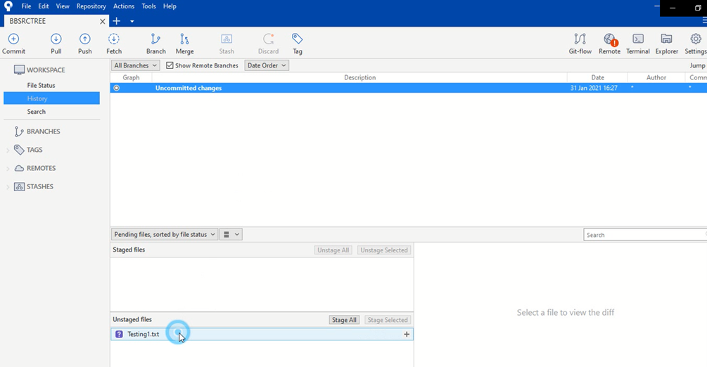 6] As soon as the new file is added, the sourcetree shows it as “Uncommitted changes” and the filename appears under “Unstaged files”. select the filename and click on “Stage selected”. The filename now appears under “Staged files”.