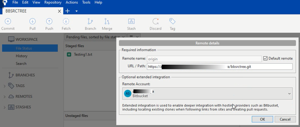 9] Click “Add” button and then specify the URL (as specified in step 2 above) and remote name as well as the bitbucket account name and click OK. Again, click OK at the next prompt.