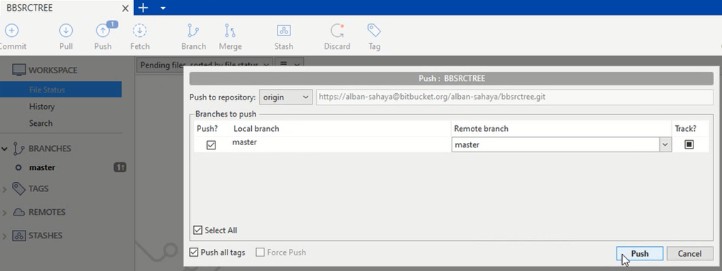 11] At sourcetree, click on “Push” button. This will open a new popup window. Check the box which indicates local branch as “master” and specify remote as “master” and then click “Push”. At the CredentialHelperSelector window, select “manager-core” and check the box “Always use this from now on”. The files get pushed to remote now.