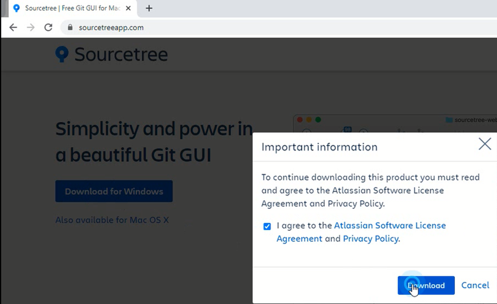 4] Sourcetree is a GUI client for Bitbucket. This is an equivalent of the Git command line client. Sourcetree can be downloaded from https://www.sourcetreeapp.com/. Click on the Download button and accept the agreement check mark followed by clicking on Download button again.