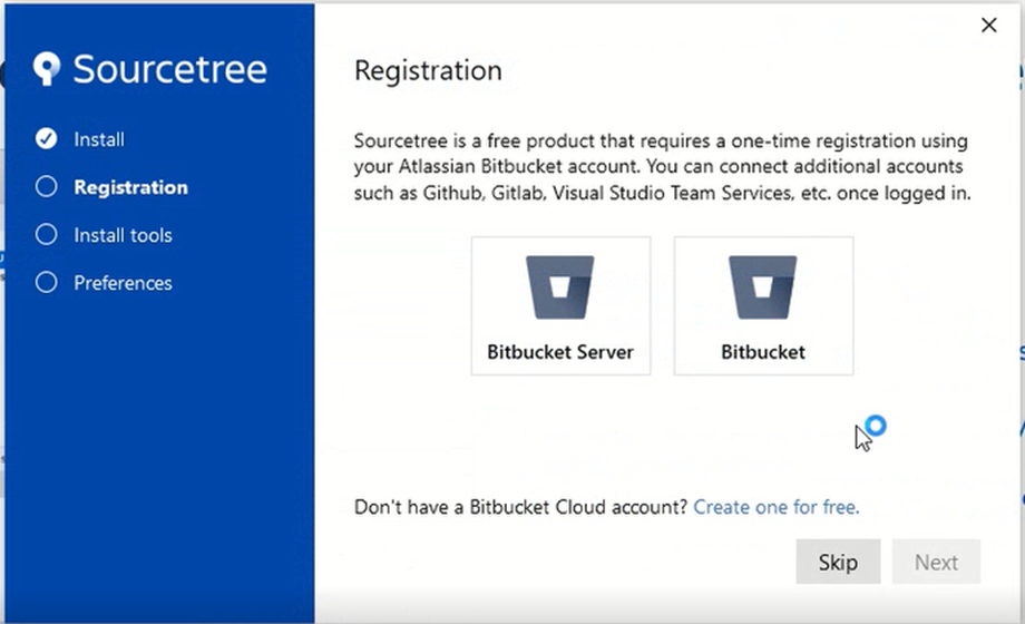 5] Double click on downloaded binary to launch the installation of Sourcetree. During the installation process, in the popup window, click on “Bitbucket” icon and click Next. The same registration id used previously with bitbucket has to be used in order to connect sourcetree client with bitbucket cloud.