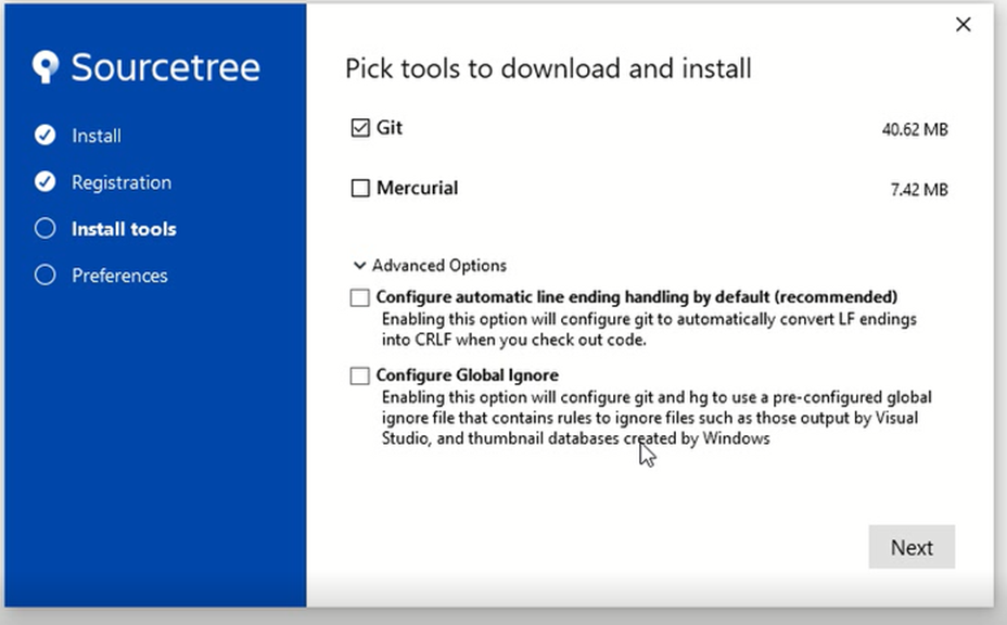 6] Once login to bitbucket is successful, a “Registration complete!” message appears. Click “Next” to continue with the installation of client tools. Select “Git” and unselect “Mercurial” and click “Next”.