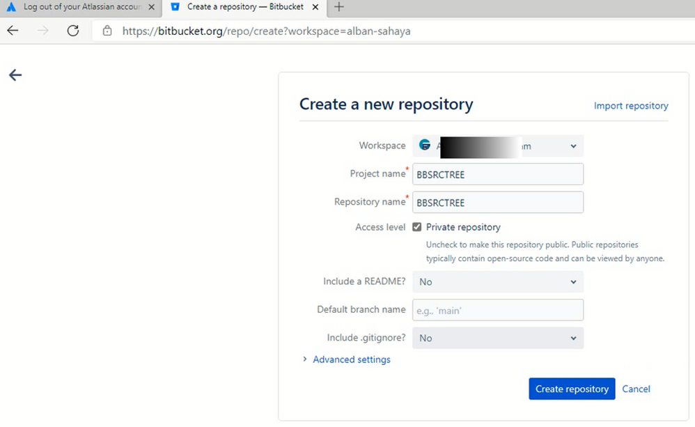 In the “Create a repository – Bitbucket” window, enter the project name, repository name, check the access level as “Private repository” and other settings as indicated below and then click “create repository”