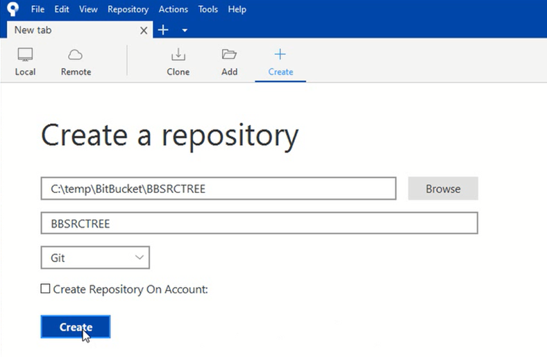 3] At Sourcetree, click on “+” icon (Create) in order to create a local repository. The folder where repository files are stored can be specified either by entering it at the specified text box or by exploring the filesystem by clicking at the “BROWSE” button. Also specify the name of the repository and the type of version control system (Git) and then click “Create” button.