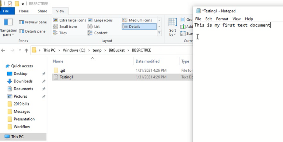 5] Create a new text file called Testing1.txt at the local folder designated for the repository and add some content to it. Then save it.