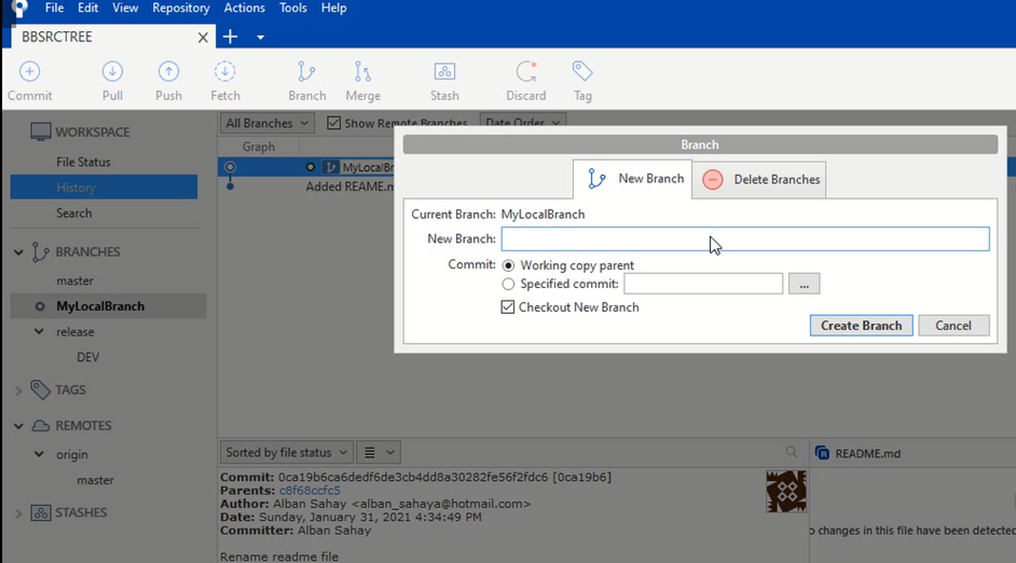 1] At sourcetree window, click on the “Branch” icon in the top. This will open a new popup window “Branch”. Enter the name of the new branch (e.g. MyLocalbranch), make sure to check the option for “Checkout New Branch” is selected and then click on “Create branch” button.