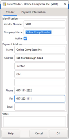 2] At the New Vendor popup window, enter the details of the vendor “Online CompStore Inc.” and click OK. Make sure the default currency for this vendor is according to the location of the business.