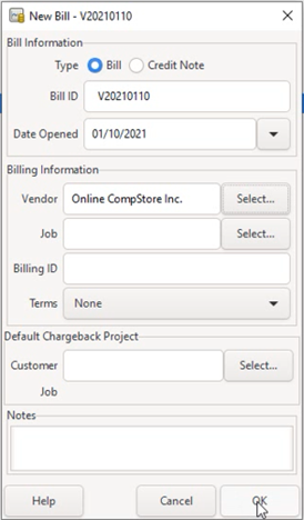 5] Enter the Bill ID, Date Opened as shown below. Also find and select the vendor “Online CompStore Inc.” which was added in step 2. This task is similar to finding and selecting the customer during the creation of new invoice. Then click OK button.