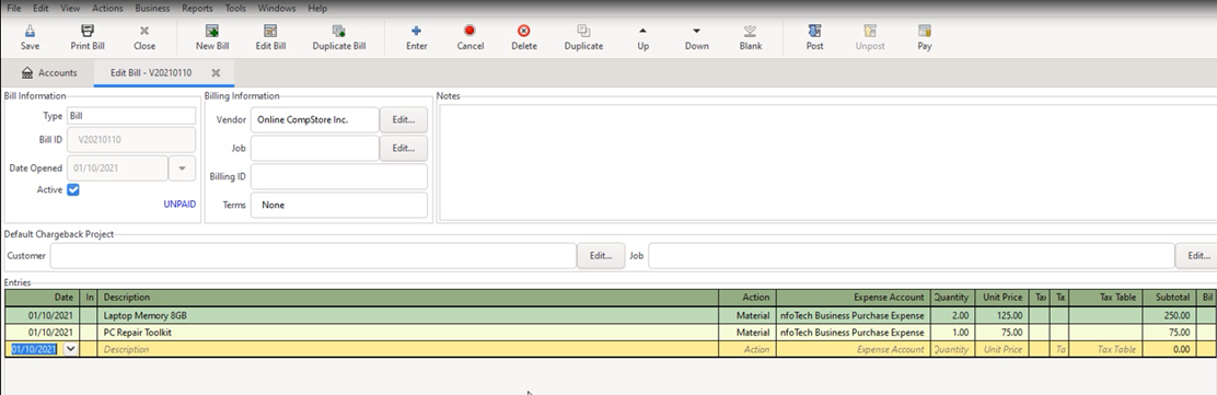 6] At the “Edit Bill – ….” Tab, enter the date, details of the items purchased, Action as “Material”, expense account as “Expenses:InfoTech Business Purchase Expense”, quantity and unit price as indicated in the screenshot below. At the last line click “Enter” key and then click “Save”.