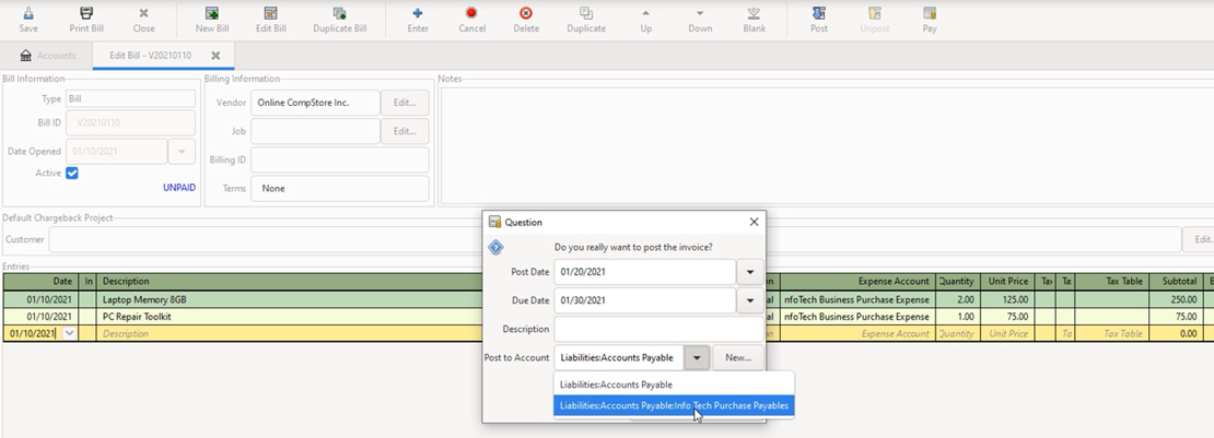 8] The bill need to be posted before payment information can be entered. Click on “Post” icon. A popup window appears asking “Do you really need to post the invoice?”. Enter the values as in the following screenshot with the post date, due date and the Post to Account (Liabilities:Accounts Payable:Info Tech Purchase Payables”). Click on “Save” icon.