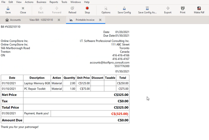 7] Click “Print Bill” icon to view the bill as it exists now. Please note that we didn’t specify tax in the bill because we took the unit price including tax. So the final total will be cost including tax. (This should be okay for small businesses assuming the sales tax given while purchasing is comparatively less than the sales tax collected due to services rendered and materials sold to vendors. In such case the sales tax to be returned will be calculated as a fraction of total income earned in many countries. However, similar to how it is done for sales, it is also possible to track cumulative sales tax given during purchases with separate sales tax given account, so that at the year end, it can be subtracted from sales tax collected and then pay the remaining to tax authorities.)